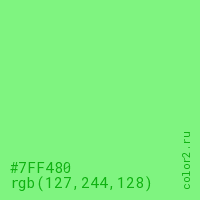 Цвет #7FF480 в цветовой модели RGB обозначается тремя октетами (127, 244, 128) в десятичном формате и #7FF480 в шестнадцатиричном (hex) формате, которые являются интенсивностью красного 127 (hex 7F), интенсивность зелёного 244 (hex F4) и интенсивность синего 128 (hex 80).