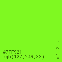 Цвет #7FF921 в цветовой модели RGB обозначается тремя октетами (127, 249, 33) в десятичном формате и #7FF921 в шестнадцатиричном (hex) формате, которые являются интенсивностью красного 127 (hex 7F), интенсивность зелёного 249 (hex F9) и интенсивность синего 33 (hex 21).
