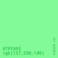 Цвет RGB(127, 250, 149) в процентом отношении количества цвета состоит из 49.8% красного (red), 98% зелёного (green) и 58.4% синего (blue).