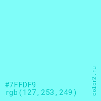 Цвет #7FFDF9 в цветовой модели RGB обозначается тремя октетами (127, 253, 249) в десятичном формате и #7FFDF9 в шестнадцатиричном (hex) формате, которые являются интенсивностью красного 127 (hex 7F), интенсивность зелёного 253 (hex FD) и интенсивность синего 249 (hex F9).