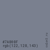 Цвет #7A808F в цветовой модели RGB обозначается тремя октетами (122, 128, 143) в десятичном формате и #7A808F в шестнадцатиричном (hex) формате, которые являются интенсивностью красного 122 (hex 7A), интенсивность зелёного 128 (hex 80) и интенсивность синего 143 (hex 8F).
