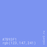 Цвет RGB(123, 147, 241) в процентом отношении количества цвета состоит из 48.2% красного (red), 57.6% зелёного (green) и 94.5% синего (blue).