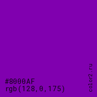 Цвет #8000AF в цветовой модели RGB обозначается тремя октетами (128, 0, 175) в десятичном формате и #8000AF в шестнадцатиричном (hex) формате, которые являются интенсивностью красного 128 (hex 80), интенсивность зелёного 0 (hex 00) и интенсивность синего 175 (hex AF).