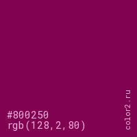 Цвет #800250 в цветовой модели RGB обозначается тремя октетами (128, 2, 80) в десятичном формате и #800250 в шестнадцатиричном (hex) формате, которые являются интенсивностью красного 128 (hex 80), интенсивность зелёного 2 (hex 02) и интенсивность синего 80 (hex 50).
