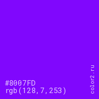 Цвет #8007FD в цветовой модели RGB обозначается тремя октетами (128, 7, 253) в десятичном формате и #8007FD в шестнадцатиричном (hex) формате, которые являются интенсивностью красного 128 (hex 80), интенсивность зелёного 7 (hex 07) и интенсивность синего 253 (hex FD).