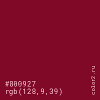 Цвет #800927 в цветовой модели RGB обозначается тремя октетами (128, 9, 39) в десятичном формате и #800927 в шестнадцатиричном (hex) формате, которые являются интенсивностью красного 128 (hex 80), интенсивность зелёного 9 (hex 09) и интенсивность синего 39 (hex 27).