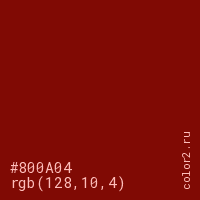 Цвет #800A04 в цветовой модели RGB обозначается тремя октетами (128, 10, 4) в десятичном формате и #800A04 в шестнадцатиричном (hex) формате, которые являются интенсивностью красного 128 (hex 80), интенсивность зелёного 10 (hex 0A) и интенсивность синего 4 (hex 04).