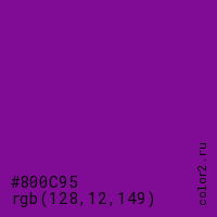 Цвет #800C95 в цветовой модели RGB обозначается тремя октетами (128, 12, 149) в десятичном формате и #800C95 в шестнадцатиричном (hex) формате, которые являются интенсивностью красного 128 (hex 80), интенсивность зелёного 12 (hex 0C) и интенсивность синего 149 (hex 95).