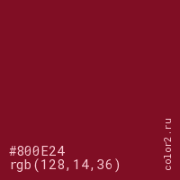 Цвет #800E24 в цветовой модели RGB обозначается тремя октетами (128, 14, 36) в десятичном формате и #800E24 в шестнадцатиричном (hex) формате, которые являются интенсивностью красного 128 (hex 80), интенсивность зелёного 14 (hex 0E) и интенсивность синего 36 (hex 24).