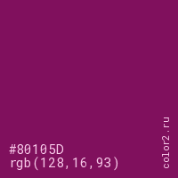 Цвет #80105D в цветовой модели RGB обозначается тремя октетами (128, 16, 93) в десятичном формате и #80105D в шестнадцатиричном (hex) формате, которые являются интенсивностью красного 128 (hex 80), интенсивность зелёного 16 (hex 10) и интенсивность синего 93 (hex 5D).