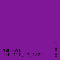 Цвет #801698 в цветовой модели RGB обозначается тремя октетами (128, 22, 152) в десятичном формате и #801698 в шестнадцатиричном (hex) формате, которые являются интенсивностью красного 128 (hex 80), интенсивность зелёного 22 (hex 16) и интенсивность синего 152 (hex 98).