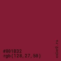 Цвет #801B32 в цветовой модели RGB обозначается тремя октетами (128, 27, 50) в десятичном формате и #801B32 в шестнадцатиричном (hex) формате, которые являются интенсивностью красного 128 (hex 80), интенсивность зелёного 27 (hex 1B) и интенсивность синего 50 (hex 32).