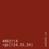 Цвет #802114 в цветовой модели RGB обозначается тремя октетами (128, 33, 20) в десятичном формате и #802114 в шестнадцатиричном (hex) формате, которые являются интенсивностью красного 128 (hex 80), интенсивность зелёного 33 (hex 21) и интенсивность синего 20 (hex 14).