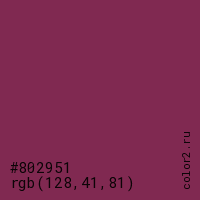Цвет #802951 в цветовой модели RGB обозначается тремя октетами (128, 41, 81) в десятичном формате и #802951 в шестнадцатиричном (hex) формате, которые являются интенсивностью красного 128 (hex 80), интенсивность зелёного 41 (hex 29) и интенсивность синего 81 (hex 51).