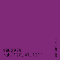 Цвет #802979 в цветовой модели RGB обозначается тремя октетами (128, 41, 121) в десятичном формате и #802979 в шестнадцатиричном (hex) формате, которые являются интенсивностью красного 128 (hex 80), интенсивность зелёного 41 (hex 29) и интенсивность синего 121 (hex 79).
