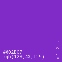 Цвет #802BC7 в цветовой модели RGB обозначается тремя октетами (128, 43, 199) в десятичном формате и #802BC7 в шестнадцатиричном (hex) формате, которые являются интенсивностью красного 128 (hex 80), интенсивность зелёного 43 (hex 2B) и интенсивность синего 199 (hex C7).