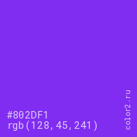 Цвет #802DF1 в цветовой модели RGB обозначается тремя октетами (128, 45, 241) в десятичном формате и #802DF1 в шестнадцатиричном (hex) формате, которые являются интенсивностью красного 128 (hex 80), интенсивность зелёного 45 (hex 2D) и интенсивность синего 241 (hex F1).