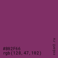Цвет #802F66 в цветовой модели RGB обозначается тремя октетами (128, 47, 102) в десятичном формате и #802F66 в шестнадцатиричном (hex) формате, которые являются интенсивностью красного 128 (hex 80), интенсивность зелёного 47 (hex 2F) и интенсивность синего 102 (hex 66).