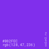 Цвет #802FEC в цветовой модели RGB обозначается тремя октетами (128, 47, 236) в десятичном формате и #802FEC в шестнадцатиричном (hex) формате, которые являются интенсивностью красного 128 (hex 80), интенсивность зелёного 47 (hex 2F) и интенсивность синего 236 (hex EC).