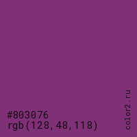 Цвет #803076 в цветовой модели RGB обозначается тремя октетами (128, 48, 118) в десятичном формате и #803076 в шестнадцатиричном (hex) формате, которые являются интенсивностью красного 128 (hex 80), интенсивность зелёного 48 (hex 30) и интенсивность синего 118 (hex 76).