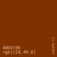 Цвет #803100 в цветовой модели RGB обозначается тремя октетами (128, 49, 0) в десятичном формате и #803100 в шестнадцатиричном (hex) формате, которые являются интенсивностью красного 128 (hex 80), интенсивность зелёного 49 (hex 31) и интенсивность синего 0 (hex 00).