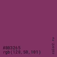 Цвет #803265 в цветовой модели RGB обозначается тремя октетами (128, 50, 101) в десятичном формате и #803265 в шестнадцатиричном (hex) формате, которые являются интенсивностью красного 128 (hex 80), интенсивность зелёного 50 (hex 32) и интенсивность синего 101 (hex 65).