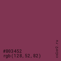 Цвет #803452 в цветовой модели RGB обозначается тремя октетами (128, 52, 82) в десятичном формате и #803452 в шестнадцатиричном (hex) формате, которые являются интенсивностью красного 128 (hex 80), интенсивность зелёного 52 (hex 34) и интенсивность синего 82 (hex 52).