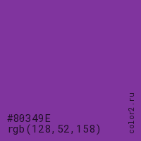 Цвет #80349E в цветовой модели RGB обозначается тремя октетами (128, 52, 158) в десятичном формате и #80349E в шестнадцатиричном (hex) формате, которые являются интенсивностью красного 128 (hex 80), интенсивность зелёного 52 (hex 34) и интенсивность синего 158 (hex 9E).