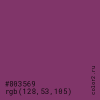 Цвет #803569 в цветовой модели RGB обозначается тремя октетами (128, 53, 105) в десятичном формате и #803569 в шестнадцатиричном (hex) формате, которые являются интенсивностью красного 128 (hex 80), интенсивность зелёного 53 (hex 35) и интенсивность синего 105 (hex 69).
