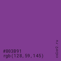 Цвет #803B91 в цветовой модели RGB обозначается тремя октетами (128, 59, 145) в десятичном формате и #803B91 в шестнадцатиричном (hex) формате, которые являются интенсивностью красного 128 (hex 80), интенсивность зелёного 59 (hex 3B) и интенсивность синего 145 (hex 91).