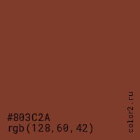 Цвет #803C2A в цветовой модели RGB обозначается тремя октетами (128, 60, 42) в десятичном формате и #803C2A в шестнадцатиричном (hex) формате, которые являются интенсивностью красного 128 (hex 80), интенсивность зелёного 60 (hex 3C) и интенсивность синего 42 (hex 2A).