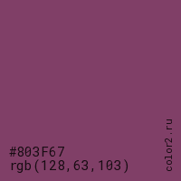 Цвет #803F67 в цветовой модели RGB обозначается тремя октетами (128, 63, 103) в десятичном формате и #803F67 в шестнадцатиричном (hex) формате, которые являются интенсивностью красного 128 (hex 80), интенсивность зелёного 63 (hex 3F) и интенсивность синего 103 (hex 67).