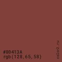 Цвет #80413A в цветовой модели RGB обозначается тремя октетами (128, 65, 58) в десятичном формате и #80413A в шестнадцатиричном (hex) формате, которые являются интенсивностью красного 128 (hex 80), интенсивность зелёного 65 (hex 41) и интенсивность синего 58 (hex 3A).