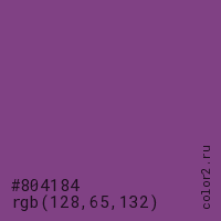 Цвет #804184 в цветовой модели RGB обозначается тремя октетами (128, 65, 132) в десятичном формате и #804184 в шестнадцатиричном (hex) формате, которые являются интенсивностью красного 128 (hex 80), интенсивность зелёного 65 (hex 41) и интенсивность синего 132 (hex 84).