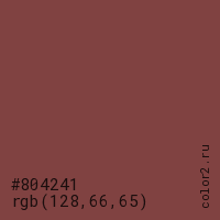 Цвет #804241 в цветовой модели RGB обозначается тремя октетами (128, 66, 65) в десятичном формате и #804241 в шестнадцатиричном (hex) формате, которые являются интенсивностью красного 128 (hex 80), интенсивность зелёного 66 (hex 42) и интенсивность синего 65 (hex 41).