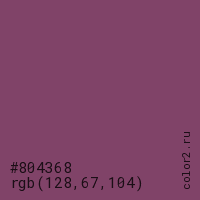 Цвет #804368 в цветовой модели RGB обозначается тремя октетами (128, 67, 104) в десятичном формате и #804368 в шестнадцатиричном (hex) формате, которые являются интенсивностью красного 128 (hex 80), интенсивность зелёного 67 (hex 43) и интенсивность синего 104 (hex 68).