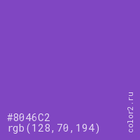 Цвет #8046C2 в цветовой модели RGB обозначается тремя октетами (128, 70, 194) в десятичном формате и #8046C2 в шестнадцатиричном (hex) формате, которые являются интенсивностью красного 128 (hex 80), интенсивность зелёного 70 (hex 46) и интенсивность синего 194 (hex C2).