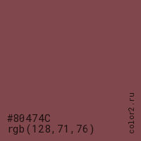Цвет #80474C в цветовой модели RGB обозначается тремя октетами (128, 71, 76) в десятичном формате и #80474C в шестнадцатиричном (hex) формате, которые являются интенсивностью красного 128 (hex 80), интенсивность зелёного 71 (hex 47) и интенсивность синего 76 (hex 4C).
