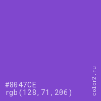 Цвет #8047CE в цветовой модели RGB обозначается тремя октетами (128, 71, 206) в десятичном формате и #8047CE в шестнадцатиричном (hex) формате, которые являются интенсивностью красного 128 (hex 80), интенсивность зелёного 71 (hex 47) и интенсивность синего 206 (hex CE).