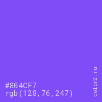 Цвет #804CF7 в цветовой модели RGB обозначается тремя октетами (128, 76, 247) в десятичном формате и #804CF7 в шестнадцатиричном (hex) формате, которые являются интенсивностью красного 128 (hex 80), интенсивность зелёного 76 (hex 4C) и интенсивность синего 247 (hex F7).
