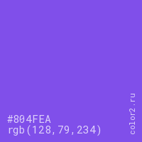 Цвет #804FEA в цветовой модели RGB обозначается тремя октетами (128, 79, 234) в десятичном формате и #804FEA в шестнадцатиричном (hex) формате, которые являются интенсивностью красного 128 (hex 80), интенсивность зелёного 79 (hex 4F) и интенсивность синего 234 (hex EA).