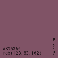 Цвет #805366 в цветовой модели RGB обозначается тремя октетами (128, 83, 102) в десятичном формате и #805366 в шестнадцатиричном (hex) формате, которые являются интенсивностью красного 128 (hex 80), интенсивность зелёного 83 (hex 53) и интенсивность синего 102 (hex 66).
