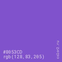 Цвет #8053CD в цветовой модели RGB обозначается тремя октетами (128, 83, 205) в десятичном формате и #8053CD в шестнадцатиричном (hex) формате, которые являются интенсивностью красного 128 (hex 80), интенсивность зелёного 83 (hex 53) и интенсивность синего 205 (hex CD).