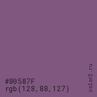 Цвет #80587F в цветовой модели RGB обозначается тремя октетами (128, 88, 127) в десятичном формате и #80587F в шестнадцатиричном (hex) формате, которые являются интенсивностью красного 128 (hex 80), интенсивность зелёного 88 (hex 58) и интенсивность синего 127 (hex 7F).