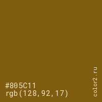 Цвет #805C11 в цветовой модели RGB обозначается тремя октетами (128, 92, 17) в десятичном формате и #805C11 в шестнадцатиричном (hex) формате, которые являются интенсивностью красного 128 (hex 80), интенсивность зелёного 92 (hex 5C) и интенсивность синего 17 (hex 11).