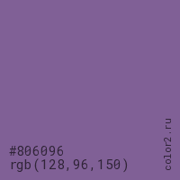 Цвет #806096 в цветовой модели RGB обозначается тремя октетами (128, 96, 150) в десятичном формате и #806096 в шестнадцатиричном (hex) формате, которые являются интенсивностью красного 128 (hex 80), интенсивность зелёного 96 (hex 60) и интенсивность синего 150 (hex 96).