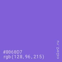 Цвет #8060D7 в цветовой модели RGB обозначается тремя октетами (128, 96, 215) в десятичном формате и #8060D7 в шестнадцатиричном (hex) формате, которые являются интенсивностью красного 128 (hex 80), интенсивность зелёного 96 (hex 60) и интенсивность синего 215 (hex D7).