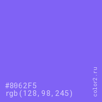 Цвет #8062F5 в цветовой модели RGB обозначается тремя октетами (128, 98, 245) в десятичном формате и #8062F5 в шестнадцатиричном (hex) формате, которые являются интенсивностью красного 128 (hex 80), интенсивность зелёного 98 (hex 62) и интенсивность синего 245 (hex F5).