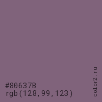 Цвет #80637B в цветовой модели RGB обозначается тремя октетами (128, 99, 123) в десятичном формате и #80637B в шестнадцатиричном (hex) формате, которые являются интенсивностью красного 128 (hex 80), интенсивность зелёного 99 (hex 63) и интенсивность синего 123 (hex 7B).
