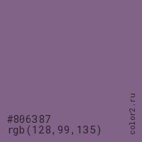 Цвет #806387 в цветовой модели RGB обозначается тремя октетами (128, 99, 135) в десятичном формате и #806387 в шестнадцатиричном (hex) формате, которые являются интенсивностью красного 128 (hex 80), интенсивность зелёного 99 (hex 63) и интенсивность синего 135 (hex 87).